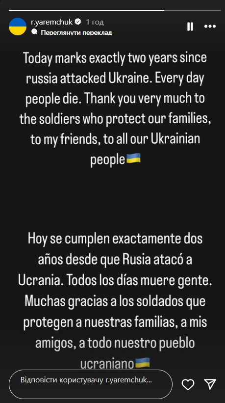 Нападник збірної України та іспанської Валенсії Роман Яремчук із приводу цього залишив короткий допис англійською та іспанською мовами, подякувавши нашим захисникам і захисницям за героїчну протидію російській агресії.