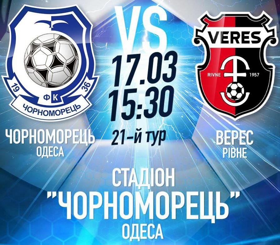 У рамках 21-го туру української Прем'єр-ліги одеський Чорноморець прийматиме на своєму полі рівненський Верес.