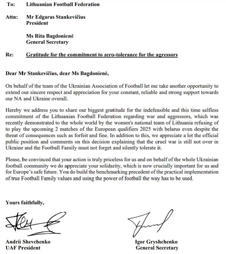 Українська асоціація футболу направила офіційного листа керівникам Литовської футбольної федерації за підписами президента Андрія Шевченка та генерального секретаря Ігоря Грищенка зі словами подяки за їхню принципову позицію.