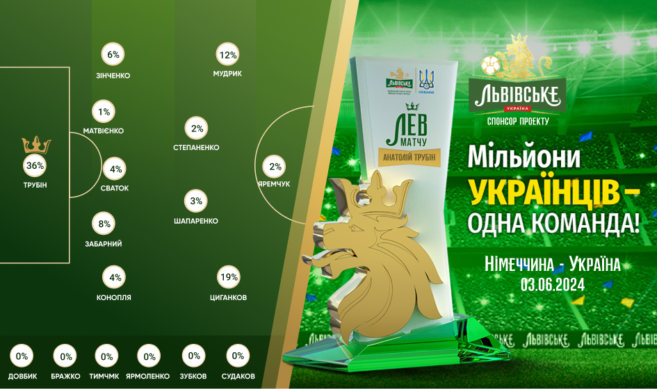 За підсумками голосування за підтримки національного спонсора збірної України, бренда "Львівське", приз "Лев матчу" у грі проти Німеччини отримав воротар нашої національної команди — Анатолій Трубін, і нікого цей факт не здивував. Забитих м'ячів у матчі не було, пропущених відповідно теж. Натомість по наших воротах завдали п’ять ударів у площину й хтось, як не захисники, мав їх усі відбивати. П’ять важливих сейвів, "сухий" матч, цілком конкурентна гра в боротьбі за місце "першого номера" на Євро.