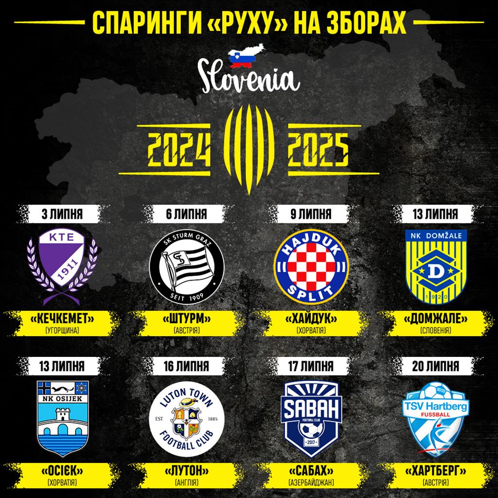 Львівський Рух на літніх зборах у Словенії зіграє вісім спарингів протягом липня, передає офіційний сайт клубу УПЛ.