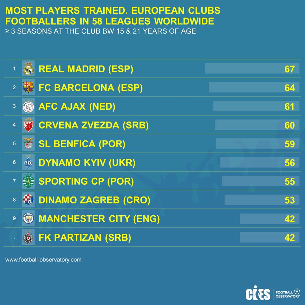 Перше місце дісталося мадридському Реалу — 67 працевлаштованих вихованців "вершкових". Друге місце у Барселони – 64, а трійку найкращих доповнює нідерландський Аякс – 61.