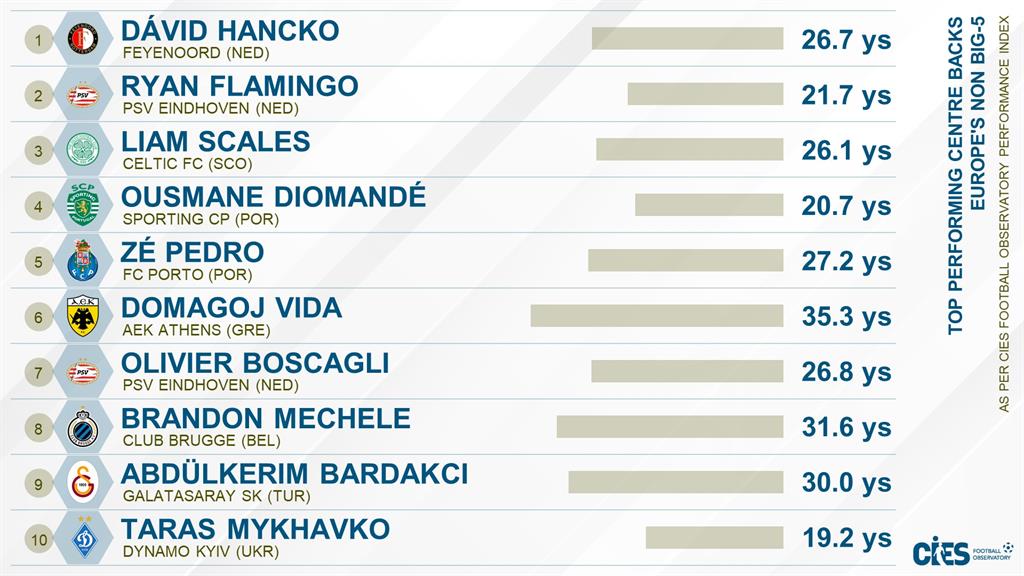 Центр спортивних досліджень CIES опублікував рейтинг найкращих центральних захисників у Європі за межами топ-5 ліг.