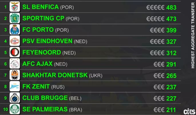 Рейтинг очолюють одразу три португальські клуби — Бенфіка (483 млн євро), Спортінг (473) та Порту (399).