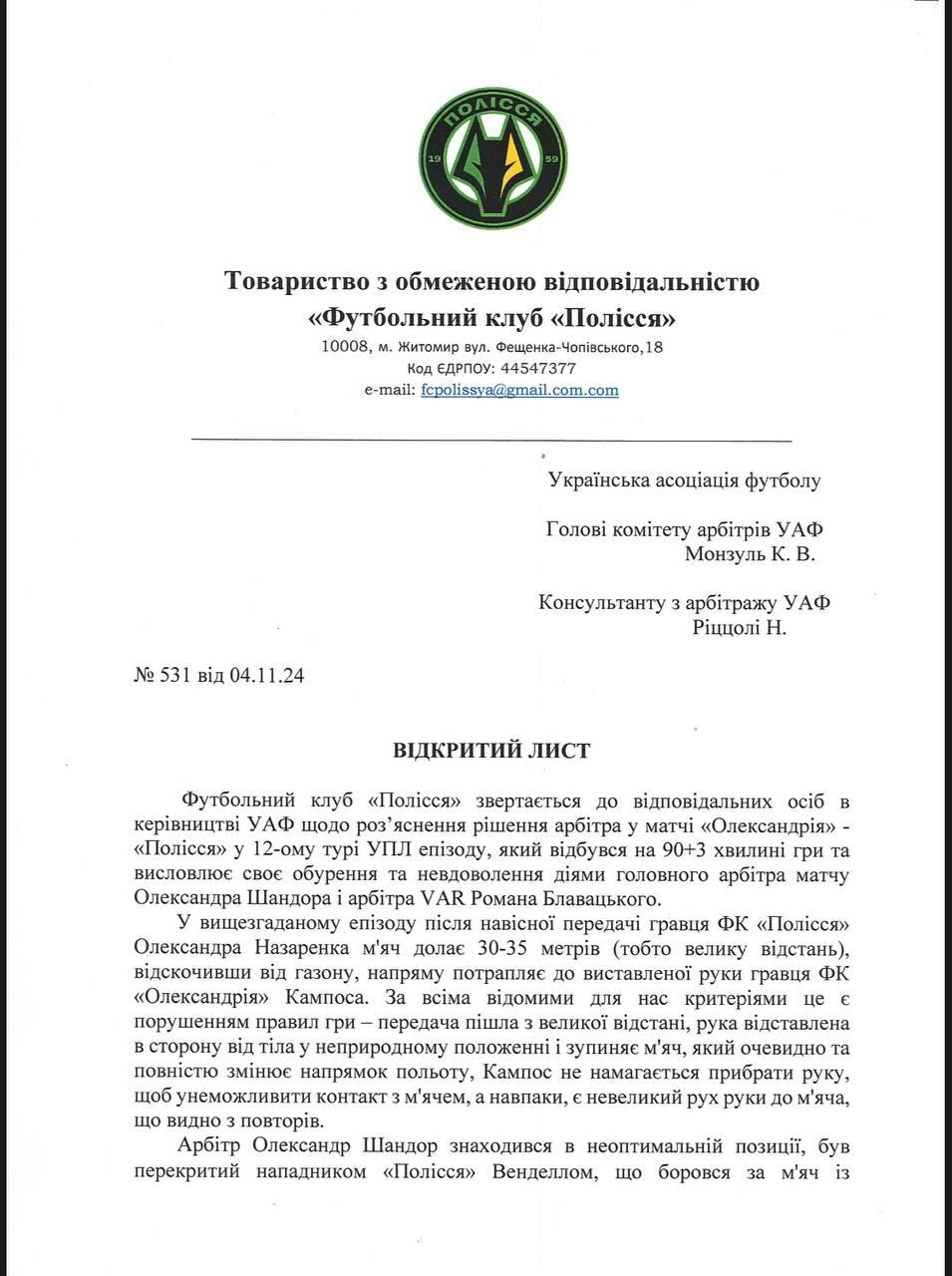 "Футбольний клуб Полісся звертається до відповідальних осіб в керівництві УАФ щодо роз'яснення рішення арбітра у матчі Олександрія – Полісся у 12-му туру УПЛ епізоду, який відбувся на 90+3-й хвилині гри та висловлює своє обурення та невдоволення діями головного арбітра матчу Олександра Шандора та арбітра ВАР Романа Блавацького.