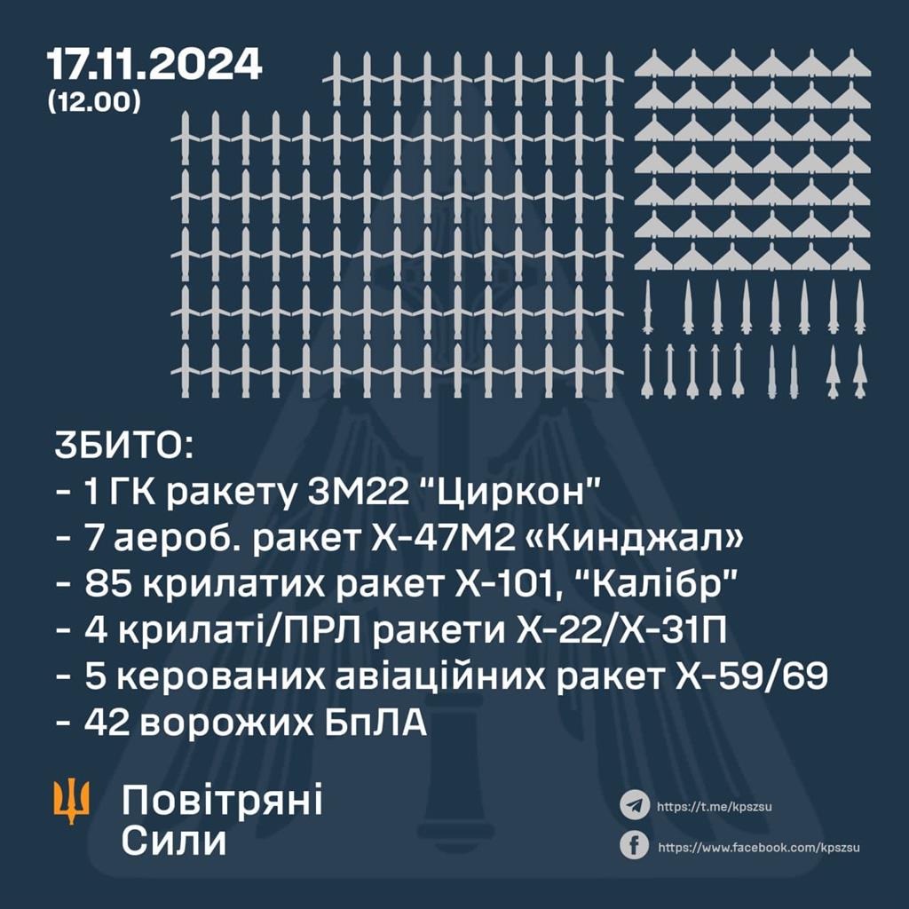 - У ніч та зранку 17 листопада росіяни атакували Україну всіма наявними типами озброєння, зокрема балістичними, крилатими та авіаційними ракетами. Загалом війська рф запустили по Україні 120 ракет та 90 безпілотників. Протиповітряна оборона знешкодила 144 повітряні цілі.