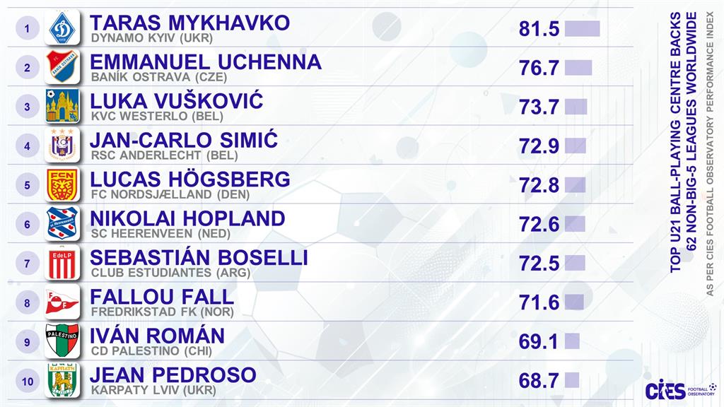 Міжнародний центр спортивних досліджень CIES представив рейтинг найкращих центральних захисників до 21 року по володінню м'ячем.