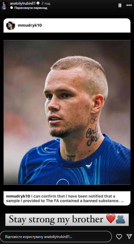 "Залишайся сильним, мій брате", — звернувся Трубін в Instagram до Мудрика.