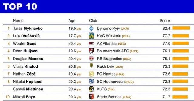 Очолив рейтинг захисник київського Динамо Тарас Михавко, який набрав 84,2 бали, випередивши Луку Вушковича з Вестерло (77,7) та Ваутера Гуса з АЗ (77,0).