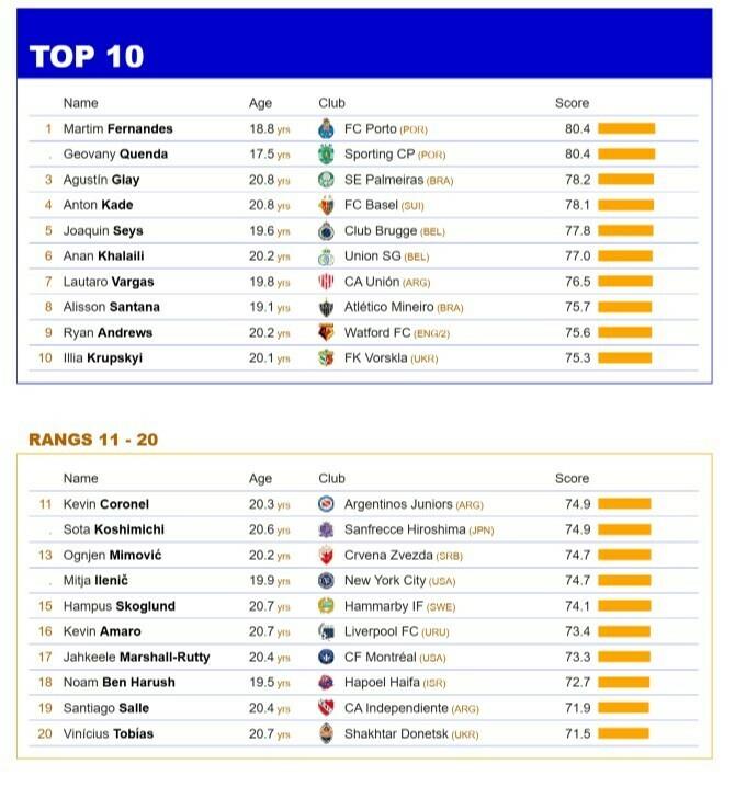 До рейтингу найкращих потрапили одразу два представники української Прем'єр-ліги — гравець Ворскли Ілля Крупський, який став десятим, та футболіст донецького Шахтаря Вінісіус Тобіас на 20 позиції.