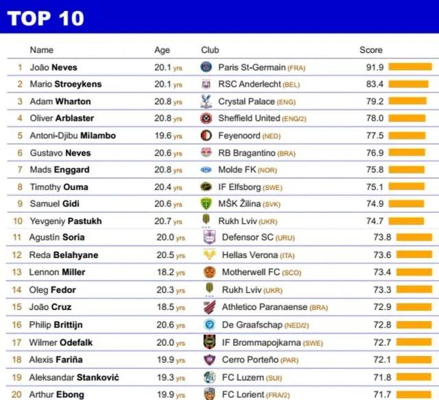 Лідирує у рейтингу півзахисник ПСЖ Жуан Невеш, який набрав 91,9 балів. До трійки найкращих увійшли Маріо Строекенс з Андерлехта та Адам Вортон з Крістал Пелес.
