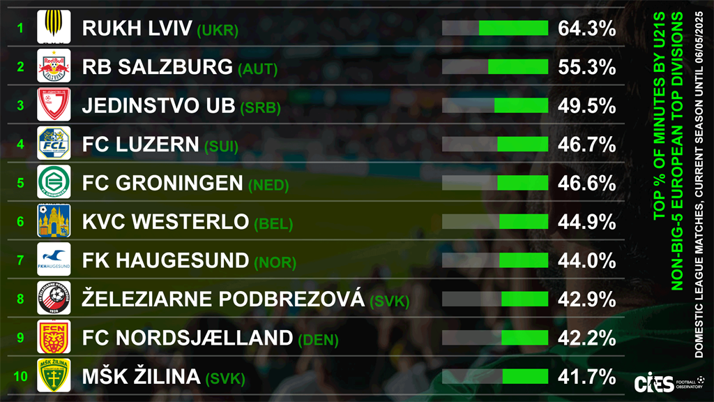 Міжнародний центр спортивних досліджень CIES опублікував рейтинг клубів не з топ-5 ліг Європи, які найбільше довіряють ігровому часу молодим гравцям.