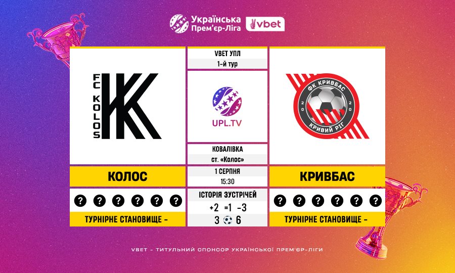 Новий сезон Української Прем'єр-ліги розпочнеться у Ковалівці, де місцевий Колос прийматиме Кривбас. Обидва колективи підходять до поєдинку з різним настроєм та амбіціями, але спільною для них залишається ціль — вдало розпочати чемпіонат.