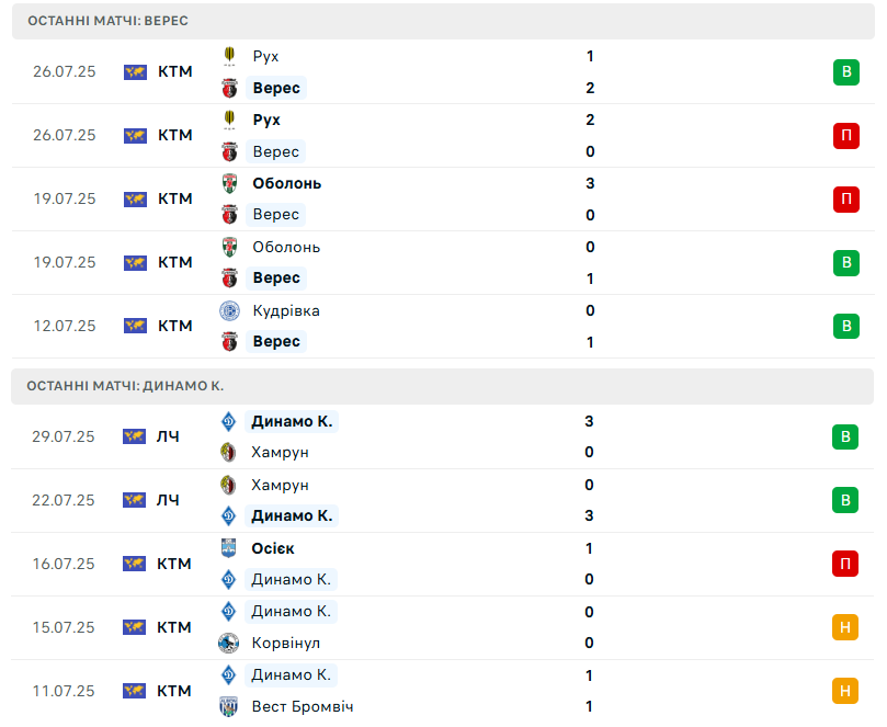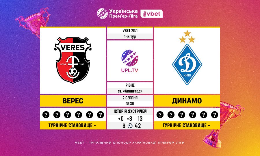 У рамках першого туру української Прем'єр-ліги зустрінуться рівненьський Верес та чинний чемпіон країни Динамо Київ. Поєдинок у Рівному обіцяє бути гарячим — господарі спробують дати бій фавориту, а гості розпочинають внутрішній сезон на тлі єврокубкових баталій.