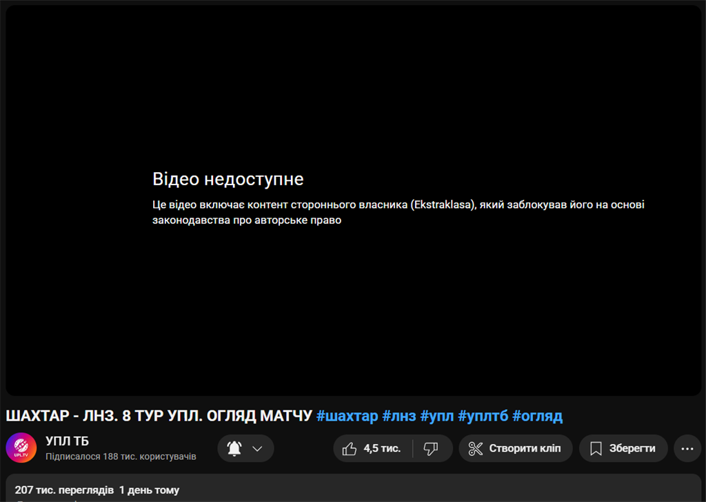У системному повідомленні зазначено, що контент Екстракляси (Ekstraklasa) — польської футбольної ліги — був виявлений у відео від УПЛ ТБ, і саме ця організація ініціювала блокування згідно із законодавством про авторське право.