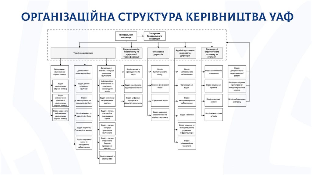 Українська асоціація футболу представила оновлену організаційну структуру керівництва та адміністративного апарату, яка передбачає чіткий розподіл відповідальності між керівними органами, дирекціями та структурними підрозділами.
