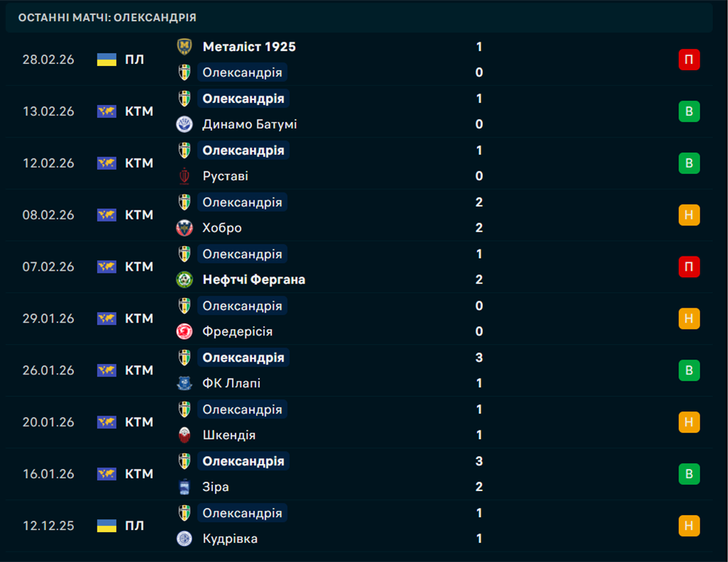 - Олександрія не вигравала в чемпіонаті в 10 останніх матчах: чотири нічиїх, шість поразок, серед них удома — п’ять ігор: нічия та чотири поразки;