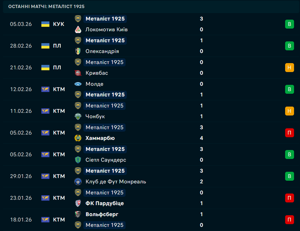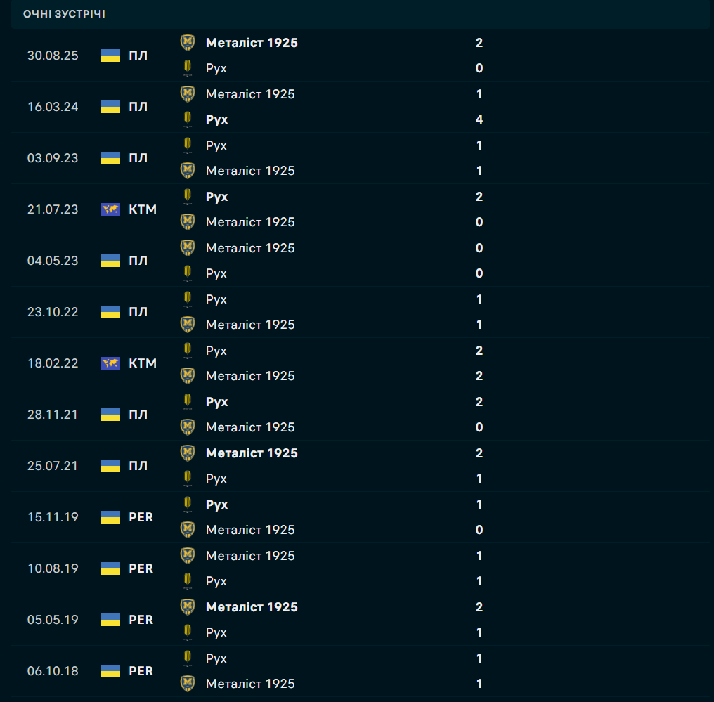 - Металіст 1925 не програвав у останніх п’яти зустрічах: три перемоги, дві нічиїх;