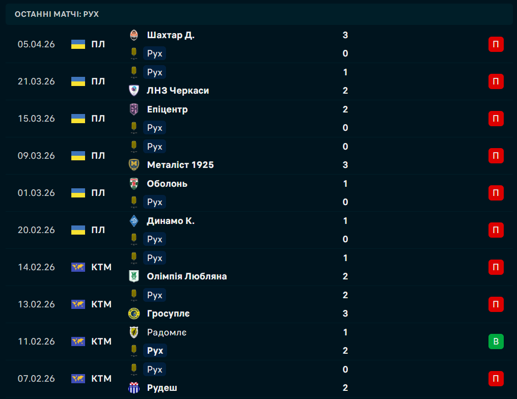 - Рух не грав унічию в останніх 12 матчах чемпіонату: чотири перемоги, вісім поразок;