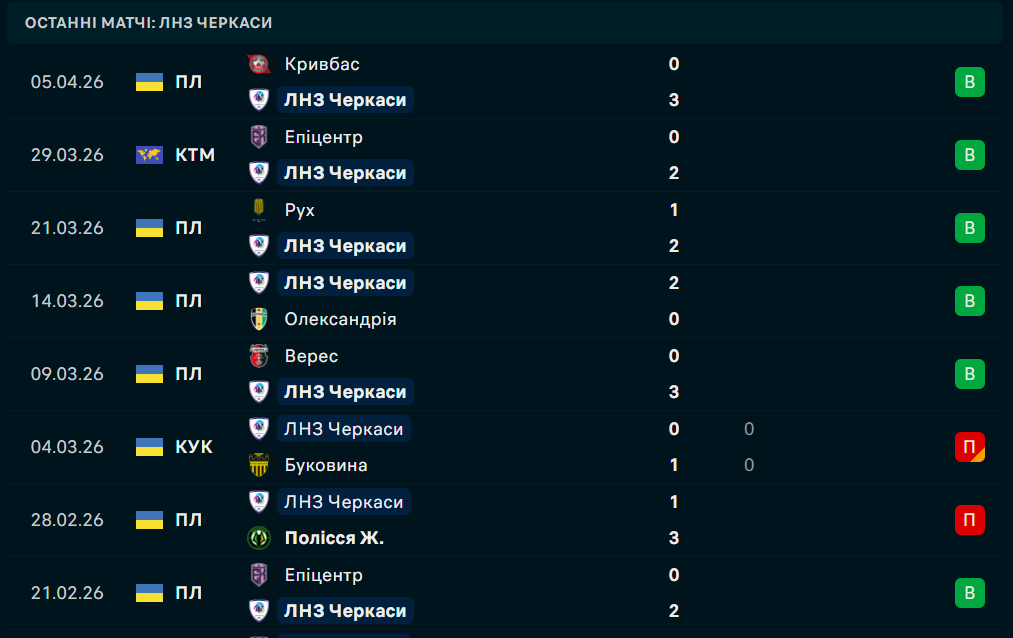 ЛНЗ на це дивиться з власної точки зору. У команди Віталія Пономарьова в 2026 році серед суперників у чемпіонаті була лише одна команда з "чемпіонської" групи. І це те саме Полісся Руслана Ротаня. Гра в Черкасах у підсумку завершилась повним фіаско для "бузкових", гру яких майстерно розібрали суперники (3:1), хоча в першому колі ЛНЗ те саме зробив із "вовками" на їхньому полі (2:0). Решта опонентів представляли нижню частину таблиці, тож не дивно, що зі своїм прагматичним футболом черкаський клуб їх зумів переграти.
