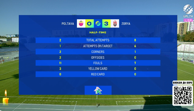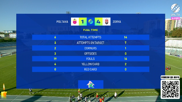 Лише після оформлення розгромного рахунку на табло СК Полтава отримала м’яч на чужій половині в свої ноги, та змогла в підсумку щось створити в атаці. Навіть удалось скоротити відставання на табло за рахунок успішного добивання від Бужина удару з лівого флангу штрафного від Вівдича, який до цього парирував Турбаєвський. Але не більше того.