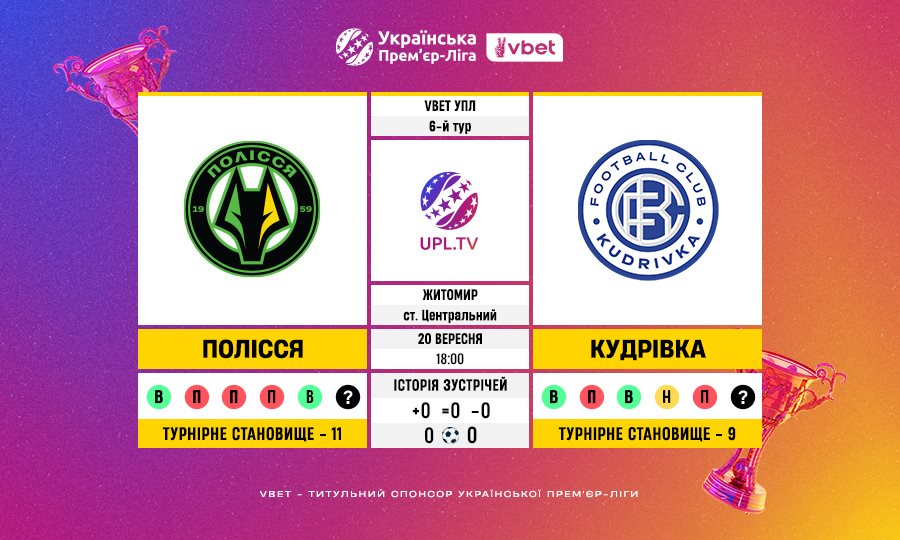 Football.ua запрошує Вас на текстову онлайн-трансляцію 6-го туру Української Прем'єр-ліги, у якому беруть участь житомирське Полісся та Кудрівка.