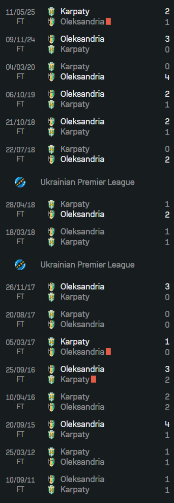 Команди раніше зустрічались в офіційних матчах 21 раз — 10 перемог Олександрії, три перемоги Карпат, а ще вісім зустрічей завершились унічию. Різниця голів — 35:18. Найбільша перемога Олександрії — 4:0 (2020), Карпат — 1:0 (2017), 2:1 (2025), 3:2 (2003).