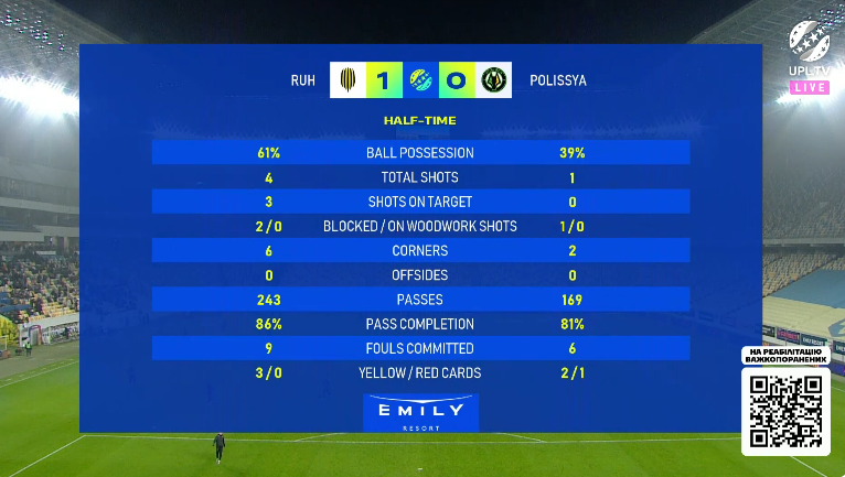 Перерва. 1:0 у нашому матчі за підсумками першої половини.