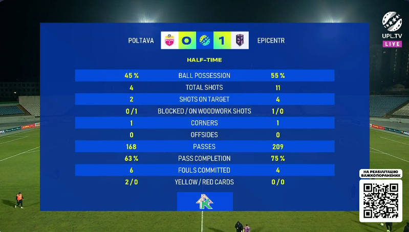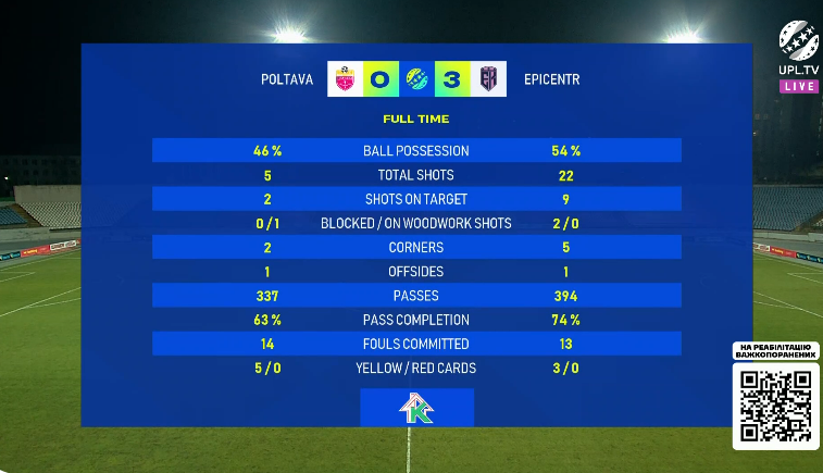 І якщо в першому таймі Епіцентр таки дозволяв суперникам щось створювати в атаці, то після перерви команда Матвійченка мала всього одну нагоду забити. Знову ж таки, ми говоримо про Марусича, але цього разу той узагалі ударом головою з подачі з лівого флангу у площину воріт не влучив. І дарма, бо суперники тим часом огріхів Полтави в обороні не пробачали.