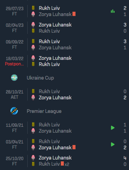 Команди зустрічались поміж собою 7 разів — чотири перемоги Зорі, одна нічия та дві перемоги Руху. Різниця голів 14:6. Останній раз команди зустрічались наприкінці липня цього року, коли Рух здобув перемогу з рахунком 2:1. Голи забивали Василь Руніч та Юрій Климчук, а за луганців відзначився Назарій Русин.