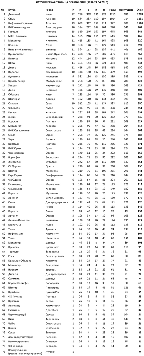 р нашей таблицы, статистик и историк Юрий Назаркевич, предоставляет вам суммарную таблицу с выступлениями 76-ми клубов. В иных рейтингах вы можете встретить и другое количество команд-участниц, и это закономерно: все еще остается не до конца утвержденным в кругу историков принцип преемственности команд. Поди разберись – имеет ли ФК Львов 90-х отношение к ФК Львов 2000-х? А разберется непосвященный в различии между СК Одесса и ФК Одесса? А как определить, например, родство сумских перволиговых клубов? У автора таблицы – свое мнение и аргументация, у автора этого вводного текста – свое, у десятка других историков и статистиков – свое. К общему знаменателю наша отечественная футбольная историография, похоже, пока не готова.