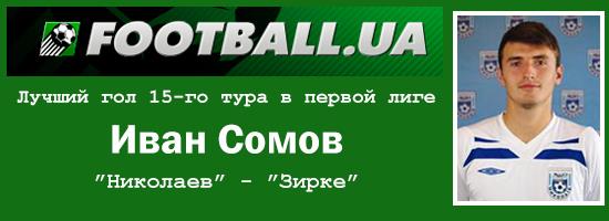 В иных турах однозначно претендовали бы на первенство в этой номинации удары по девяточкам сумчанина Западни и комсомольчанина Королькова (лауреат прошлого тура также мог победить и в этом – гол у него получился весьма красивый). Однако отдаем должное редкому для первой лиги исполнению – николаевец Сомов забил такой мяч, который был бы к лицу лучшим южно-европейским чемпионатам. Цитируем отчет: «Рядовой аут с левого фланга, Загинайлов изящно пробросил в центр, где Сомов с показательной легкостью и с изяществом принял, пробросил мимо зазевавшихся соперников и переправил мяч в сетку». Остапенко вбрасывает с аута, Загинайлов под опекой защитников в касание направляет мяч в штрафную, а Сомов, который неожиданно туда ворвался, успевает принять, крутнуться вокруг своей оси и легким ударом пробить мимо вратаря. Та непринужденность, с которой забивался этот мяч, обескураживает и заставляет задуматься, что же ты за матч включил: это и вправду первая украинская лига, точно не Примера или чемпионат Бразилии?
