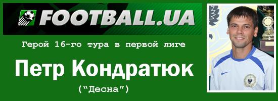 Большой и серьезный выбор в отчетном туре: дубли оформили комсомольчанин Корольков, днепродзержинец Кулиш и киевлянин Хлебас, великолепный матч против своей бывшей команды в Кировограде выдал алчевец Логинов, были свои яркие личности и в сенсационных черновицком и тернопольском матчах. Но мы отдаем должное самому возрастному полевому игроку первой лиги сезона 2013/2014, который не доигрывает, а играет! Говорим, конечно же, о полузащитнике черниговцев Кондратюке, чья великолепная игра помогла Десне стать первой в сезоне командой, обыгравшей непобедимую Александрию. Два гола записал на свой актив в матче с лидером Петр, а также заработал пенальти (к досаде черниговцев, не реализованный Картушовым) и начал третью результативную атаку своей команды. Браво!