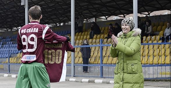 №99 сменил на №100: перед началом матча Скала – Шахтер Св директор ФК Скала Александра Кравчук вручила одному из лидеров стрыйской команды Владимиру Прышнивскому памятный сувенир – именную футболку с цифрой 100. Именно столько матчей №99 стрыян провел за Скалу в чемпионатах страны этот игрок. Столько же лет юбиляру? Всего 20! Такие они, молодые «ветераны» одного из самых самобытных коллективов второй лиги.
