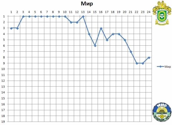 Новый сезон второй лиги стал необычным, ведь впервые с 90-х низший профессиональный дивизион объединился в одну группу. И вот именно Мир быстрее всех приспособился к обновленному второлиговому бекграунду. Пока другие команды налаживали свою игру после существенного обновления составов, пока молодые игроки других клубов привыкали к новому для себя уровню, пока не знавшие ранее друг друга соперники с разных частей Украины ожидали сюрпризов в каждом матче – сыгранная и возрастная горностаевская команда уверенно захватила лидерство. Вплоть до 14 тура команда Сапельняка не покидала первую тройку, а на протяжении 9 туров из этих 14 она была на первом месте (никому в этом сезоне подобное достижение не покорялось!).