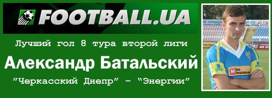На этот раз выбор ограничен, но особенный гол нашелся. Речь идет об ударе головой в падении черкассца Александра Батальского, который открыл счет в матче Энергия – Черкасский Днепр. Цитируем обзор: «Когда показалось, что атака «речников» по левому флангу захлебнулась, Бушман принял неожиданное решение переадресовать мяч пяткой Бессалову, а навес нестареющего душой ветерана замкнул ударом головой в падении Батальський».