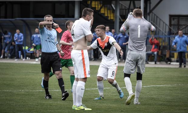 Ключевой момент стрыйского матча – арбитр уже достает красную карточку, чтобы наказать вратаря дончан Ставицкого за фол на форварде хозяев Лазаренко.