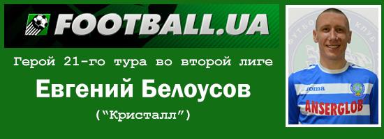 Опытный воспитанник херсонского футбола прибыл в Кристалл своевременно, ведь после отставки Рыженко у команды наметился дефицит форвардов. Но некоторое время Евгению не удавалось показать свою игру – были и досадные промахи, и «серые» матчи, от которых и вспомнить-то нечего. Но в матче с белоцерковцами Белоусову удалось выдать и эффектную, и эффективную игру. Это он открыл счет, сыграв в завершении по-бомбардирски, а когда вратарь спас свою команду после второй попытки нападающего – его атаку довел до конца товарищ, успевший на добивание.