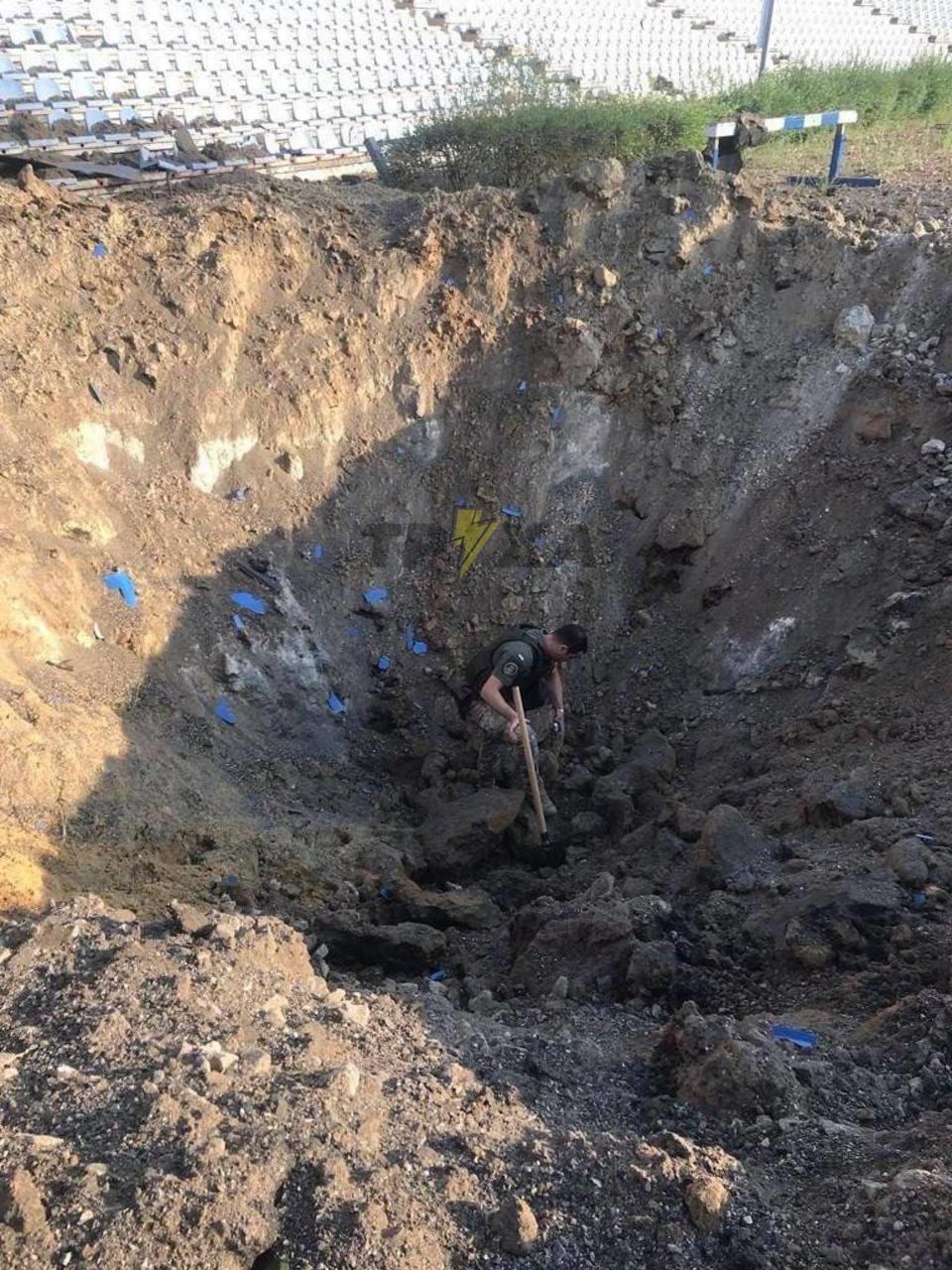 Поруч із газоном стадіону утворилася вирва шириною близько 15 метрів та глибиною близько 5 метрів. Уламки ракетного снаряда можна побачити поряд.
