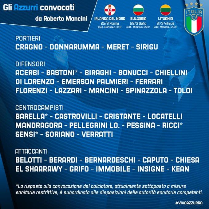 Главный тренер национальной сборной Италии Роберто Манчини назвал 38 футболистов, которые будут готовиться к отборочным матчам ЧМ-2022 в марте — сообщил официальный Твиттер сборной Италии.