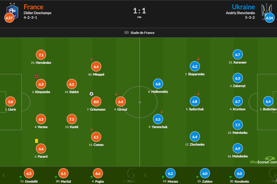 Лучшим игроком встречи стал Антуан Гризманн, который стал автором единственного мяча французов. Его действия оценили в 8,0. Худшим в составе французов и в матче в целом стал вратарь Уго Льорис — 5,8.