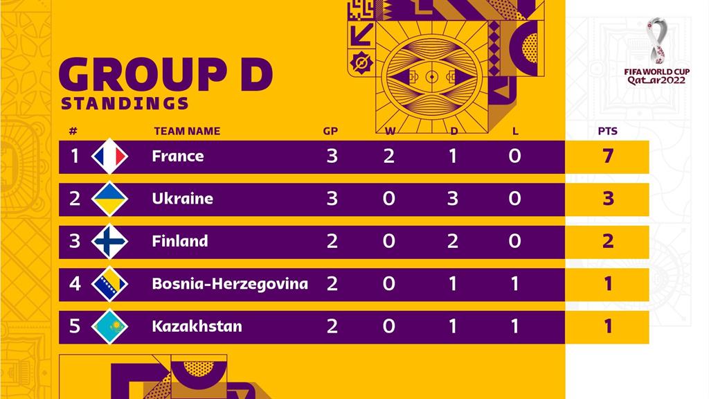 Первое место в группе занимает Франция, набравшая семь очков в трех играх. У финнов два балла после двух игр, а у Боснии и Герцоговины и Казахстана по одному баллу, но у боснийцев есть игра в запасе.