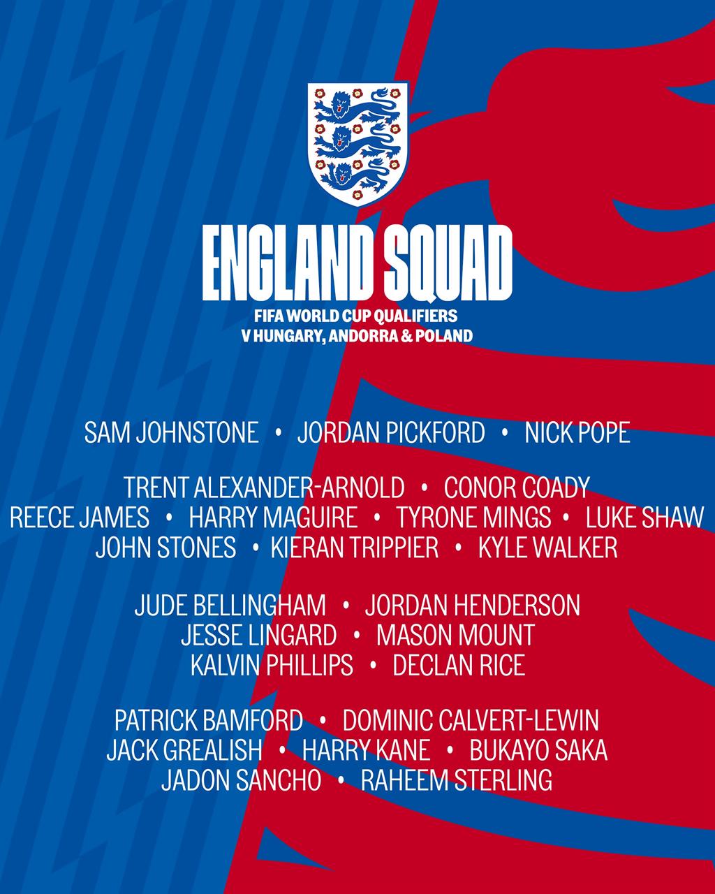Сборная Англии в своем официальном твиттере объявила состав на предстоящие поединки отборочной кампании Чм-2022 в Катаре.