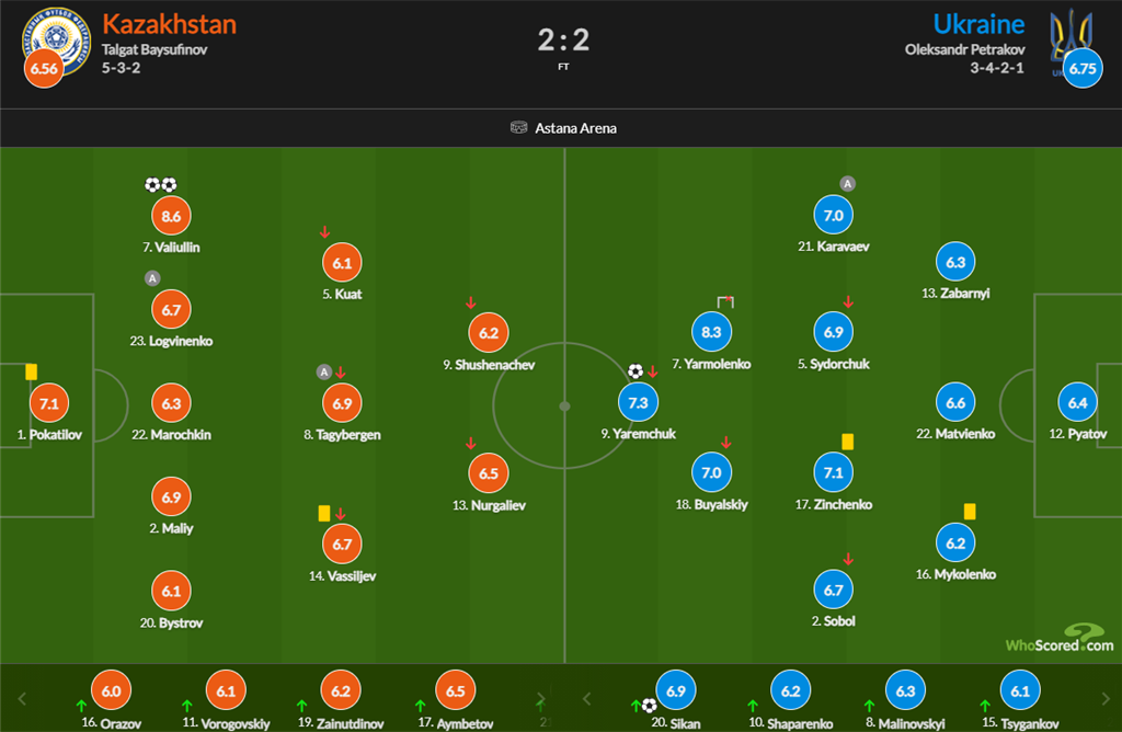 Ярмоленко получил оценку 8,3. Лучшим игроком встречи стал защитник Казахстана Руслан Валиуллин с оценкой 8,6.