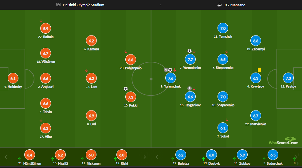 Что касается лучшего в составе соперника, то им стал Теэму Пукки, который также отличился забитым мячом — 7,3.