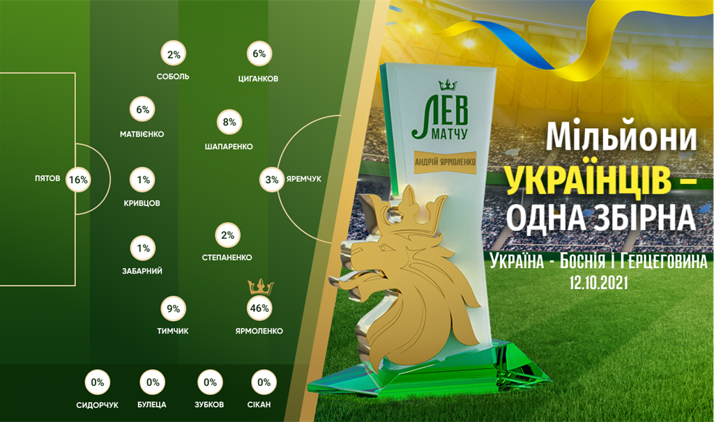 По итогам голосования, при поддержке спонсора сборной Украины ТМ Львівське, приз "Лев матчу" в игре против боснийцев получил полузащитник нашей национальной команды — Андрей Ярмоленко, который забил во втором матче кряду. Это, к слову, уже 44-й гол Андрея за национальную команду.