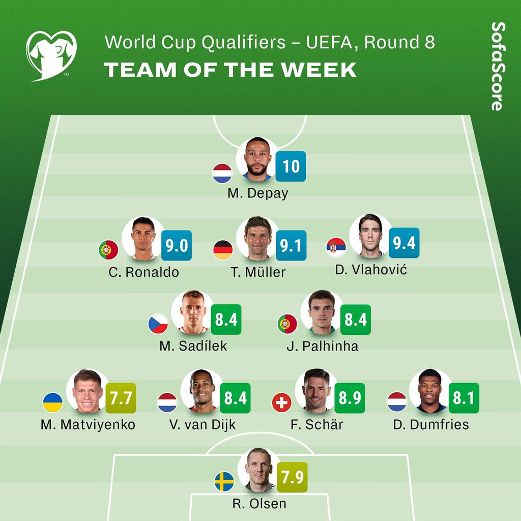 Авторитетный статистический портал SofaScore представил символическую команду недели по итогам восьмого тура отборочного цикла ЧМ-2022.