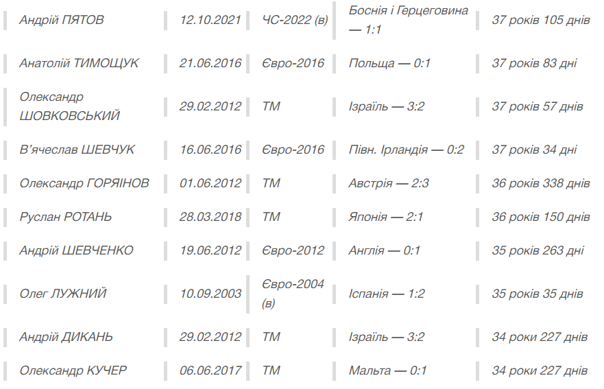 В день матча против Финляндии Пятову исполнилось 37 лет и 102 дня. Тимощуку в последнем своем матче за сборную исполнилось 37 лет и 83 дня.