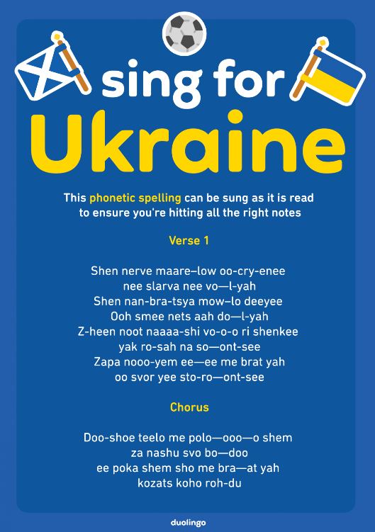 Ми хочемо, щоб всі вболівальники Шотландії проявили свою солідарність у виконанні гімну та показали, що вони єдині з Україною", — сказав менеджер Duolingо Колін Воткінс.