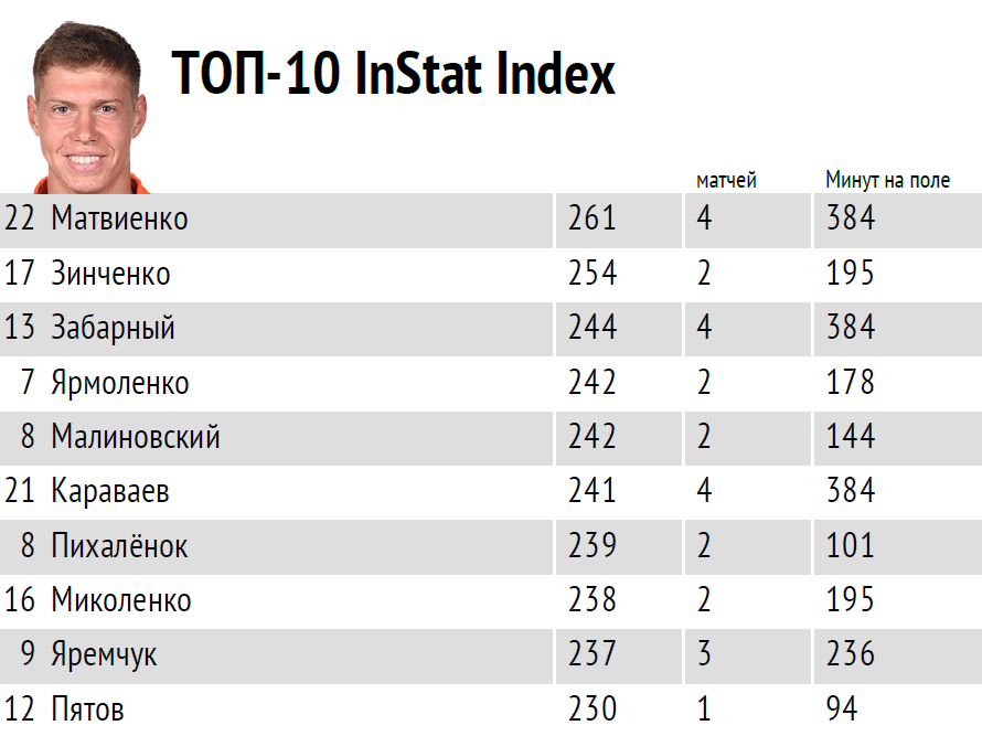 Показник InStat Index 26-річного захисника склав 261. Слідом за Матвієнком у трійку найкращих також увійшли півзахисник Манчестер Сіті Олександр Зінченко (254) та захисник Динамо Київ Ілля Забарний (244).